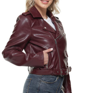 Made from high-quality leather or premium faux leather, the jacket features a smooth, polished finish that feels soft yet durable. The carefully tailored structure creates a flattering slim fit that enhances the body shape while remaining comfortable for all-day wear. The rich burgundy shade adds depth and elegance, making it a standout alternative to traditional black or brown jackets.
