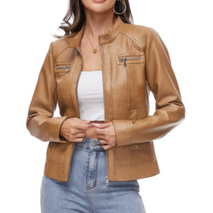 Perfect for women who appreciate classic fashion with a modern twist, this tan leather biker jacket is an essential addition to any wardrobe.